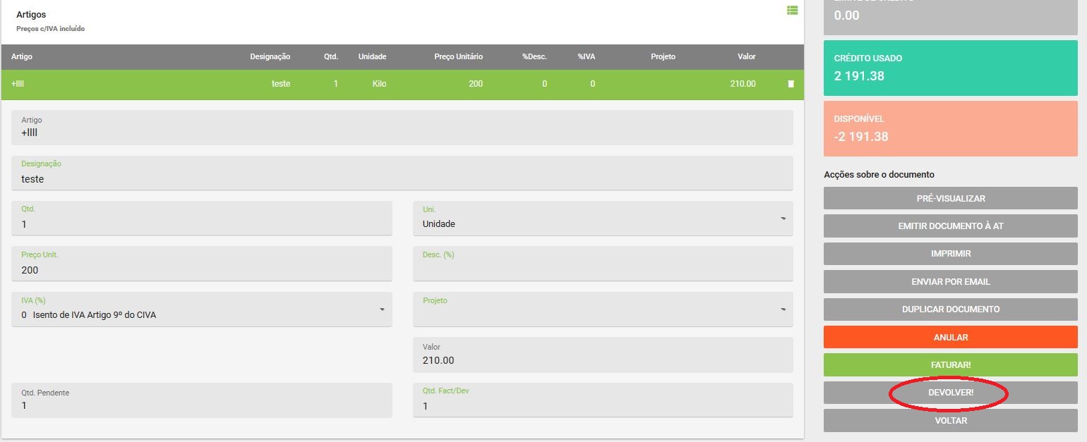 Para devolver o artigo o processo é semelhante. Também clica no Artigo em questão e coloca a Quantidade a devolver no campo “Qtd. Fact/Dev”.
